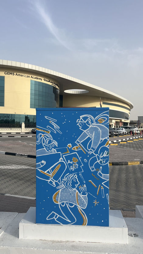 This set of artworks designed for a school setting, beautifully blends themes of education, curiosity, and space exploration. On one end, students engage in learning activities surrounded by books, plants, and various symbols of knowledge.